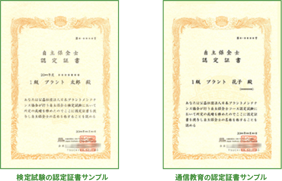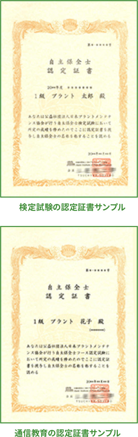 自主保全士認定者には、以下の認定証書を受講申込み担当者(個人申込み者は本人)宛にお送りいたします。